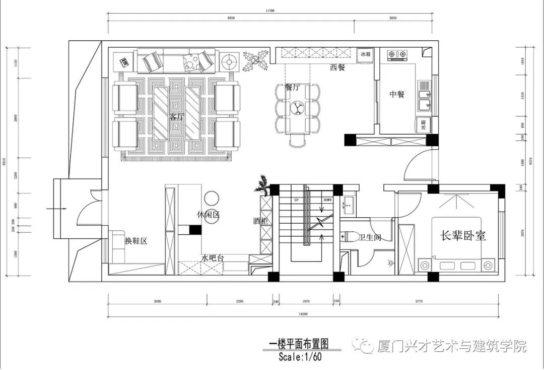 在平面布置图阶段,以学生的易犯错误点,图纸图层颜色是否美观统一,尺寸是否符合人体工程等为要求来规范。