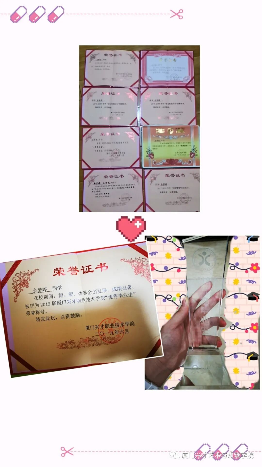 余梦婷的成绩始终名列前茅,她一直说“努力不一定强调成功,尝试就会有收获,一分耕耘一分收获。”余梦婷最爱的一句,“天将降大任于斯人也,必先苦其心志,劳其筋骨,饿其体肤,空乏其身,行拂乱其所为,所以动心忍性,曾益其所不能。”秉承着这些理念,余梦婷总是保持着积极向上的心态,以及在工作中孜孜不怠,勤勉努力,毫不懈怠。正是因为有了这些,余梦婷在大学期间荣获:“三好学生”、“优秀团干”、“优秀学生干部”、“迎评先锋”、“校一等奖学金”、“优秀助理”等荣誉,并在CAD团体赛中荣获三等奖。